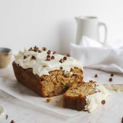 Top this easy chocolate chip banana bread with vanilla buttercream to swank it up a bit or leave it plain for those times when you just need a sweet pick me up.