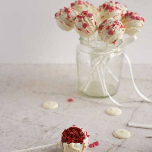 You don’t have to bake a cake especially for cake pops (although you can if you like). You can use offcuts, leftovers, cupcakes – anything really – to make these easy cake pops. I made these using the offcuts from the red velvet mini cakes I made earlier.