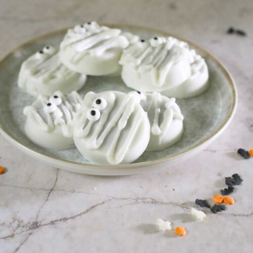 You can either use melted white chocolate or candy melts, depending on the flavour you’d like (or what you have to hand). If you use white chocolate and want the mummies to be paler, just add some Colour Mill food colouring (or similar – it needs to be oil based colouring though otherwise it won’t work). White candy melts are already white and usually have a vanilla flavour which works well with the chocolately yumminess of the Oreos.
