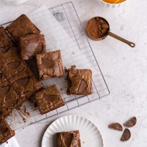 Chocolate and orange is a flavour combination made in heaven. These chocolate orange brownies are so easy to make, and a great way to use up any leftover Terry’s Chocolate Oranges from Christmas. The brownies are fudgy, chocolatey and soft with a delicious hint of orange. This easy brownie recipe takes less than 10 minutes to prepare and is so easy – the kids will love helping you make it!