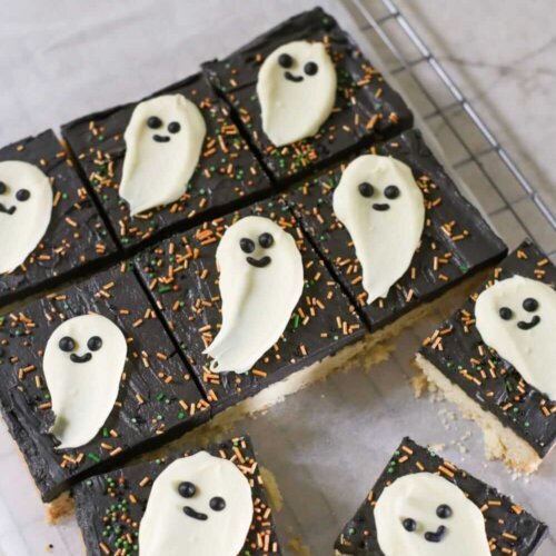 - Assemble – Spread the black buttercream over the cooled cookie base. Top with your set white chocolate ghosts. Cut into squares and serve.