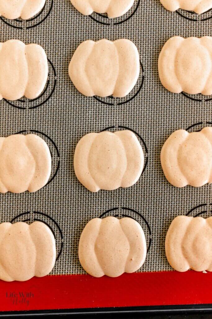 - Transfer to a piping bag fitted with a round tip. Pipe pumpkin-shaped shells onto the silicone mat using a template if needed.