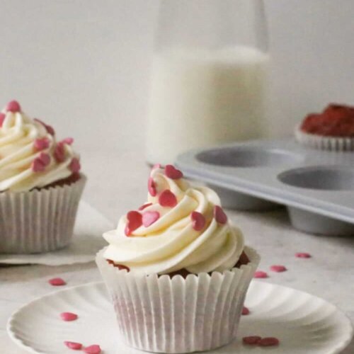 A classic red velvet cupcake recipe calls for buttermilk, but you can make these red velvet cupcakes without buttermilk – simply use milk with some lemon juice added to it! I never have buttermilk in and this substitute works really well.